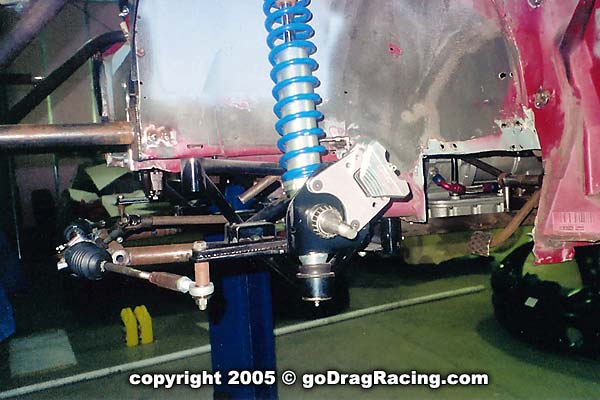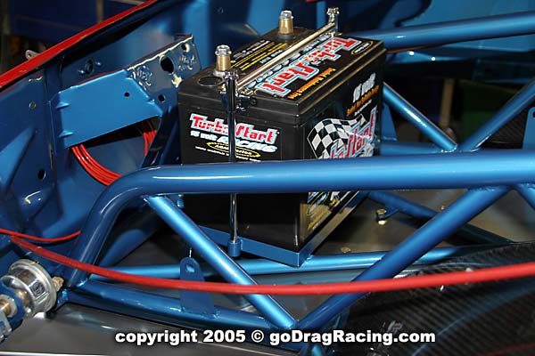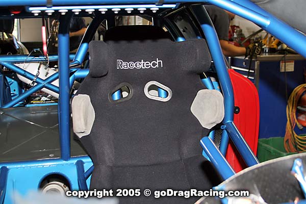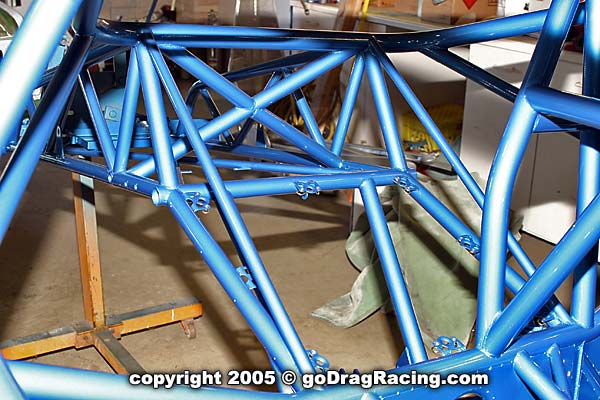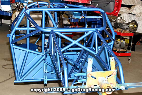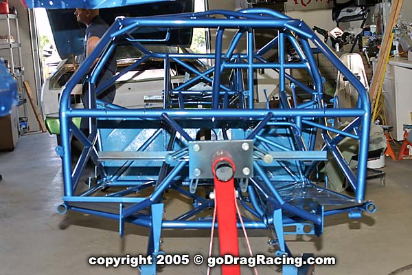 Final touches are the Safecraft fire system, 16 volt battery, seat mounts, Wheelie bars. All the bracketry for the parachutes and the custom switch panel are in place and the wiring and plumbing is finished down to the line lock. Brake lines hug the chassis and the work on this is exceptional.